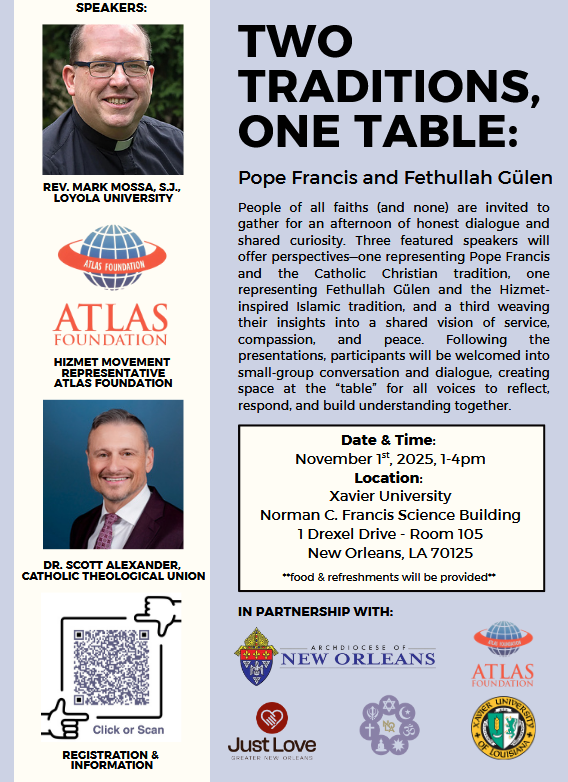 On Saturday, November 1, 2025, the Atlas Foundation and the New Orleans Interfaith Alliance gathered community members at Xavier University for Pope Francis & Fethullah Gülen: Two Traditions, One Table. The afternoon offered a meaningful space for dialogue, reflection, and connection across faith traditions.